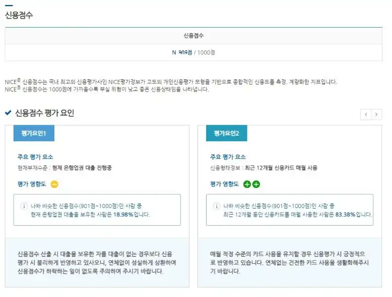 본인인증까지 완료후 조회를 하면 상세한 신용점수 내역을 확인하실수 있습니다. 점수는 1000점기준으로 높을수록 신용이 좋다는것을 의미합니다.