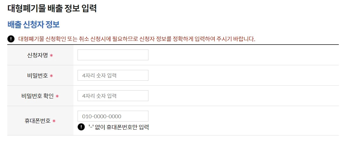 3. 폐기물 스티커 인터넷 접수를 클릭하고 배출신청자 정보를 입력해 줍니다.