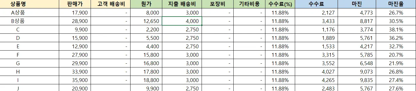 상품명에 마진율을 계산하려는 상품명을 기입하시고 판매가 원가 등을 입력하시면 자동으로 마진율 계산이 됩니다.
