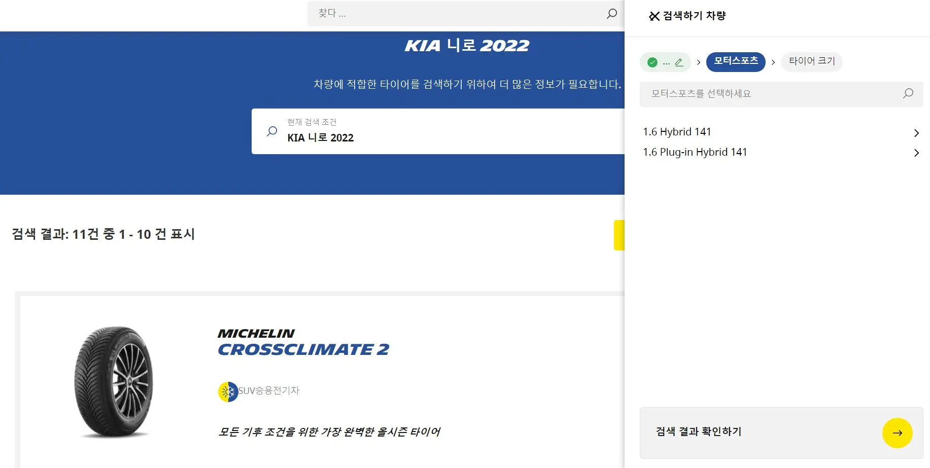 3. 기아의 니로 차량을 예시로 검색해 보았습니다. 차량 세부모델명을 선택하면 차량에 맞는 타이어 종류가 나옵니다.