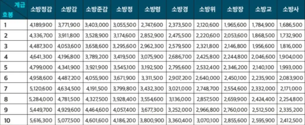 소방공무원 급여체계는 호봉제입니다. 인사혁신처에서 제공하는 봉급표에 따라 기본급이 정해지고 1년이 경과될 때마다 호봉이 높아지면서 기본급 또한 높아지는 구조입니다. 봉급표 자체도 물가상승 등을 해마다 반영하니 알아두시면 좋을 것 같습니다.