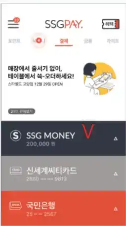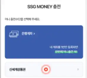 앱을 실행한 후 회원가입을 하신 다음 메인화면의 결제탭을 클릭한후 맨첫번째 SSG MONEY메뉴를 클릭하세요. 그다음 충전하기 버튼을 눌러주시기 바랍니다.