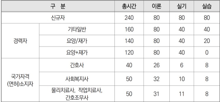 요양보호사 교육기관에서 표준 교육과정은 240시간 국가자격(면허) 소지자(간호사, 간호조무사, 물리치료사, 사회복지사, 직업치료사)는 40~50시간, 경력자(경력 인정기관에 따라 이수시간 다름)의 교육과정을 이수해야 요양보호사 자격시험에 응시 가능합니다. 응시 자격 자가진단을 통해 응시자격 유무를 바로 확인해 보세요.