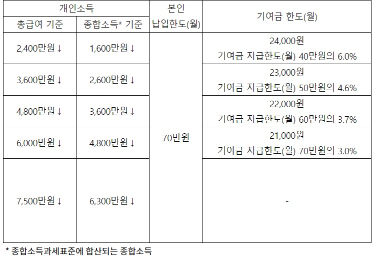 | 거주지 및 소득 | 아래 1~4의 요건을 모두 충족하는 자 1. 신규 가입일 기준 만 19세~34세 이하(병역복무기간 최대 6년 추가 인정) 2.(개인소득) 총급여액 7,500만원 이하(종합소득금액 6,300만원이하) 3.(가구소득) 가구원 수에 따른 기준 중위소득 180% 이하에 해당하는 자 4. 직전 3개년도 중 1회 이상 금융소득종합과세 대상자 제외 |