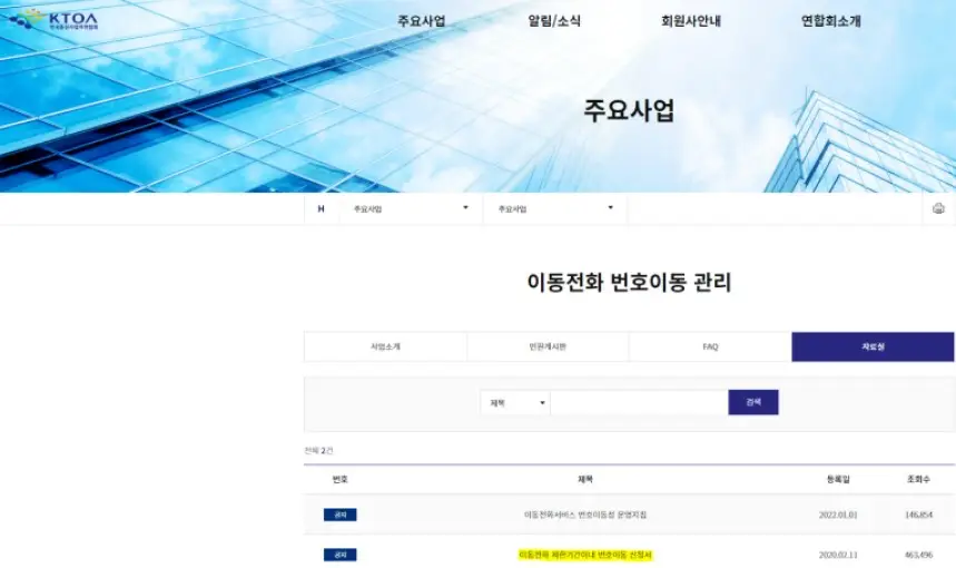 KTOA(한국통신사업자연합회) 홈페이지에 접속 후 주요 사업클릭>>이동전화번호이동 관리센터 클릭>>자료실