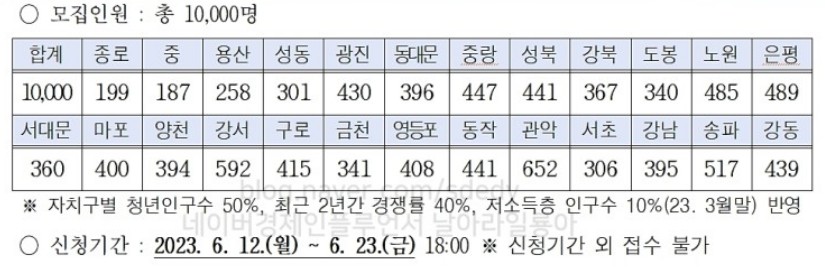 | 연령 및 거주지 | 2023년 5월 22일 기준 서울시 거주하는 만 18세~ 만 34세 청년 출생일이 1988년 1월11일~2005년 12월 31일 해당되는자 |